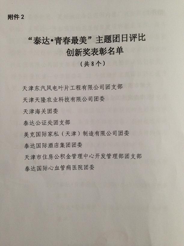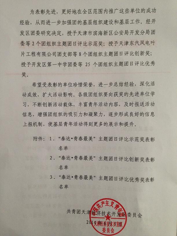 在天津开发区组织的“泰达●青春最美”主题团日评比活动中,香港六宝典资料大全团委组织的“五四”青年节系列活动参评,并荣获创新奖。