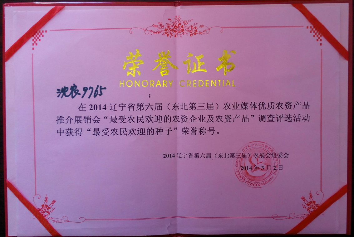 我公司水稻品种“沈农9765”在众多品牌中脱颖而出,在调查评选活动中荣获种子类唯一“最受农民欢迎的种子”荣誉称号。