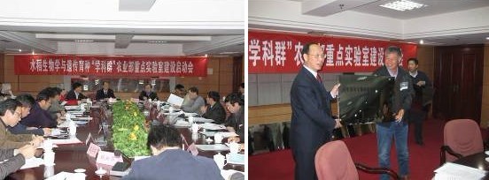 启动会上,程式华所长、王小虎局长分别就农业部水稻生物学与遗传育种学科群建设提出了几点建议和希望。接着进行了区域/专业性重点实验室、科学观测实验站授牌仪式和学术委员会委员聘任仪式,武汉大学朱英国院士等13位专家被聘为学术委员会委员。随后农业部水稻生物学与遗传育种重点实验室学术委员会第一次会议正式召开,与会专家共同审核了“学科群”工作规则和农业部水稻生物学与遗传育种重点实验室章程,重点研讨了“学科群”各实验室和观测站“十二五”研究方向。通过研讨,委员们提出了许多建设性的意见和建议,将对学科群的建设和发展具有重要的指导意义。